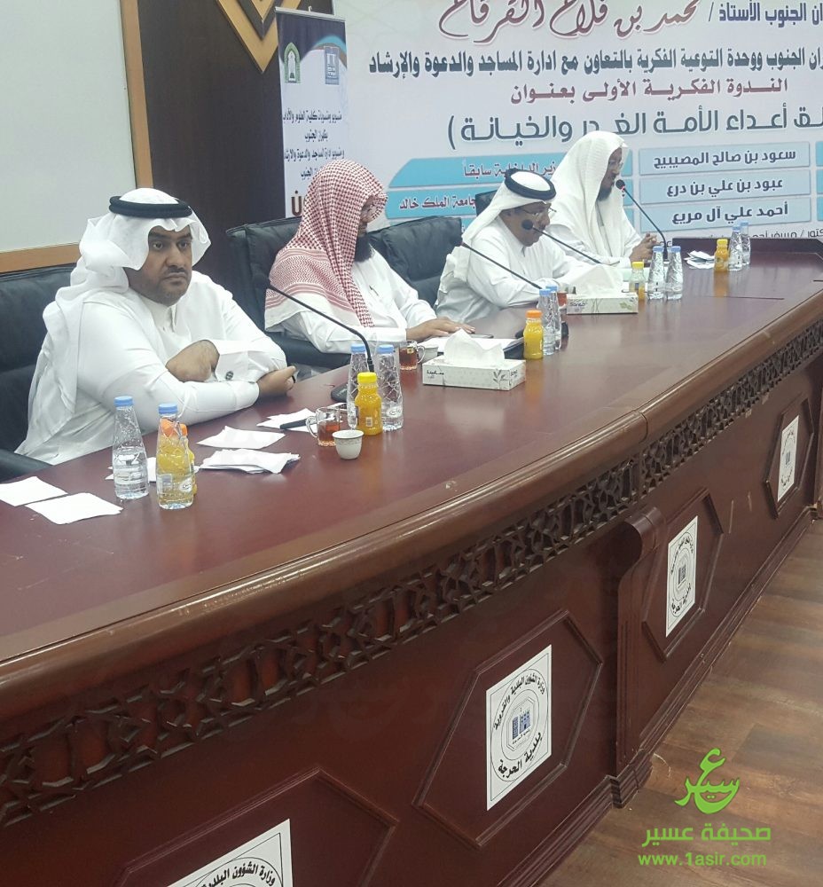 برعاية محافظ ظهران الجنوب الأستاذ محمد بن فلاح القرقاح وبحضور مديري ورؤساء الإدارات الحكومية نظمت كلية العلوم والآداب بالمحافظة ووحدة التوعية الفكرية في جامعة الملك خالد وبالتعاون مع إدارة المساجد والدعوة والإرشاد مساء اليوم الثلاثاء 1438/7/14 الندوة الفكرية الأولى بعنوان ( خلق أعداء الأمة الغدر والخيانة ) من تقديم الدكتور مسفر بن أحمد الوادعي عميد كلية العلوم والآداب في ظهران الجنوب ونائب وحدة التوعية الفكرية . والتي احياها الدكتور سعود المصيبيح مستشار وزير الداخلية سابقا والدكتور عبود بن درع عضو هيئة التدريس بكلية الشريعة في جامعة الملك خالد والدكتور أحمد آل مريع عميد كلية المجتمع بخميس مشيط ورئيس نادي ابها الأدبي .