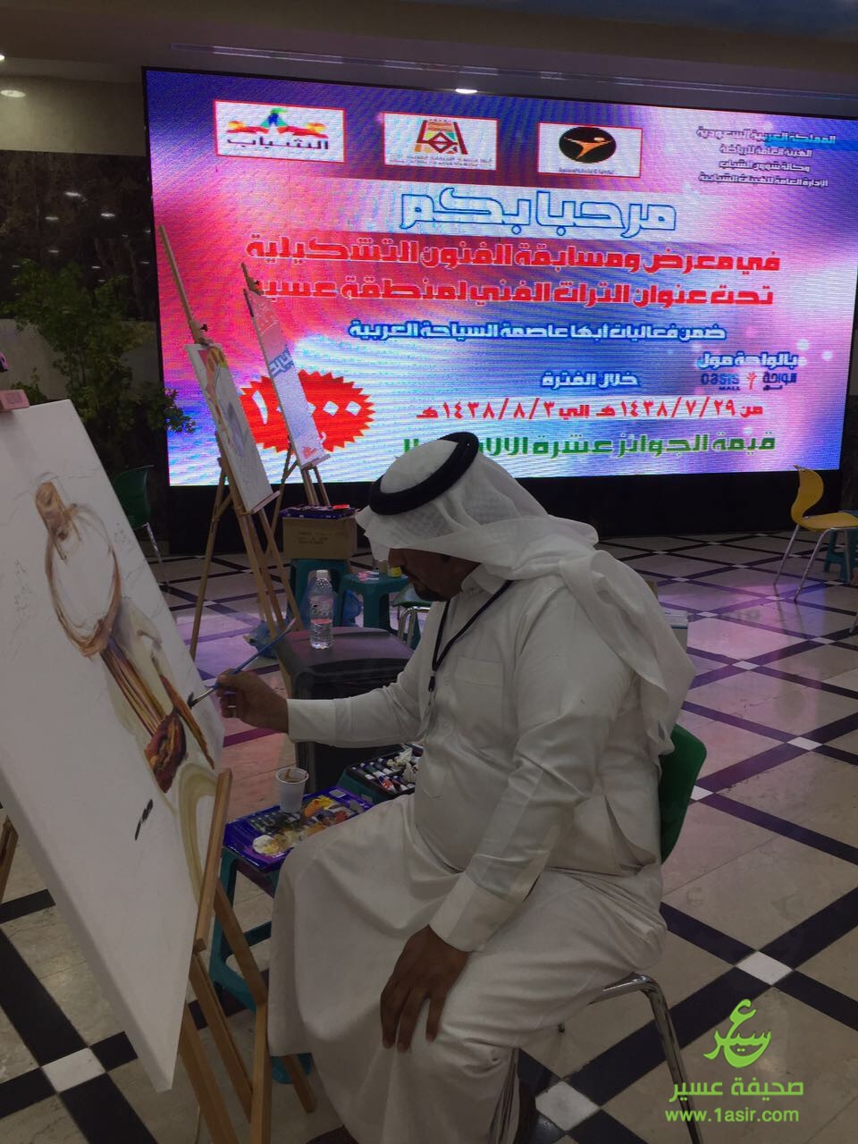 انطلق مساء اليوم الأربعاء معرض ومسابقة الفن التشكيلي، الذي تنظمه وكالة شؤون الشباب ممثلة في الإدارة العامة للهيئات الشبابية ومكتب الهيئة بمنطقة عسير، والمقام في محافظة محايل بمقر الواحة مول. ويستمر لغاية يوم السبت 1438/8/3، حيث يهدف المعرض إلى تطوير وتنمية مهارات الفن التشكيلي لشباب المنطقة.