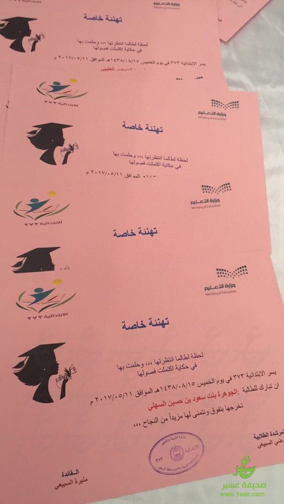 حينما نقف اليوم على عتبات التخرج ونرسم بأناملنا الأمل ونرى البسمة وقد ارتسمت لتعانق الشفاه ومشاعل العلم استحقت تنير دروبنا نحو النجاح هاهي ابتدائية ٣٧٣ بحي اشبيليا بالرياض تحتفل بتخريج طالباتها من الصف السادس وذلك يوم الخميس الموافق ١٤٣٨/٨/١٥ وقد ابتدا الحفل بالسلام الملكي اعقب ذلك مشهد من اداء طالبات الصف السادس يستعرض ذكرياتهن عند التحاقهن بالمدرسة الى وصولهن للصف السادس تلا ذلك أنشودة ترحيبية بعد ذلك كلمة قائدة المدرسة أ/ منيرة محمد السبيعي رحبت فيها بالطالبات وأوصتهم على مواصلة النجاح بعد ذلك عرض عن فرحة التخرج قدمتها كوكبه من الطالبات اعقبها مسيرة الخريجات وسط أهازيج انشادية بعدها تم تكريم طالبات الصف السادس من قبل ادارة المدرسة .