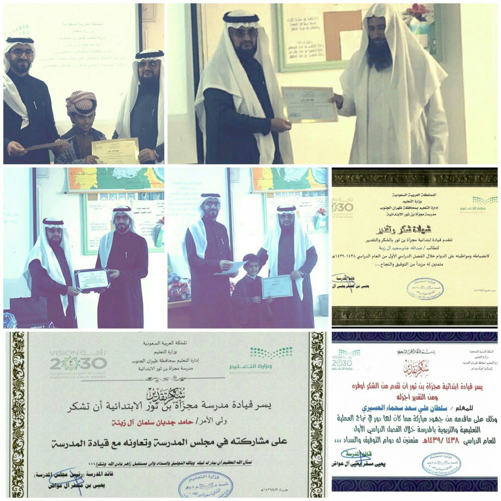 وقد تخلل البرنامج تكريما للطلاب المتميزين في الأنشطة والمتفوقين وأبناء المرابطين على الحدود والمنضبطين دراسياً. كما كرم قائد المدرسة المعلمين المتميزين وبعض أولياء الأمور المتفاعل مع المدرسة