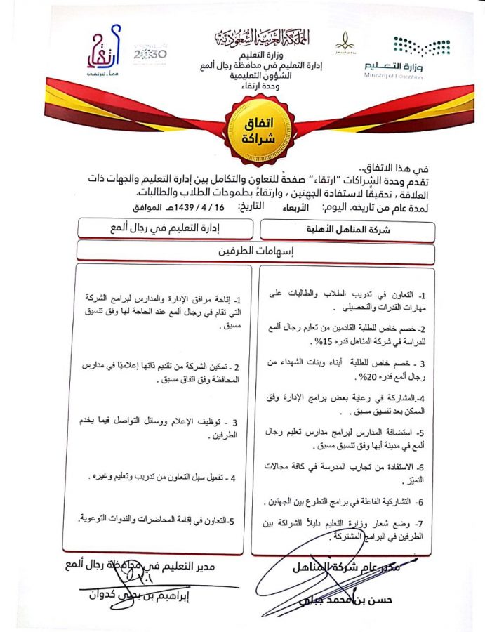وقّع مدير عام مدارس المناهل الأهلية أ. حسن محمد جبلي مذكرة تفاهم مع إدارة التعليم بمحافظة رجال ألمع برئاسة مدير التعليم أ. إبراهيم يحيى كدوان .