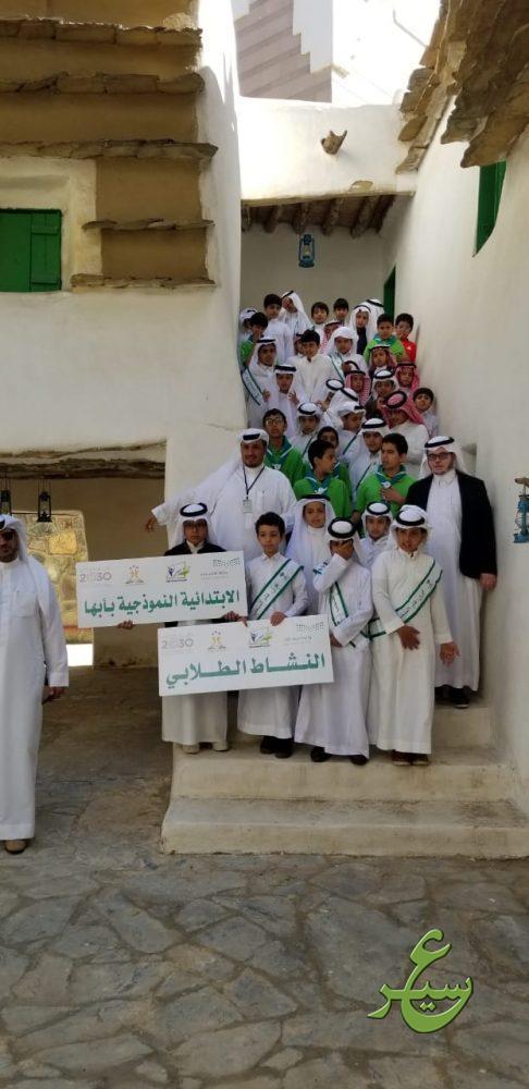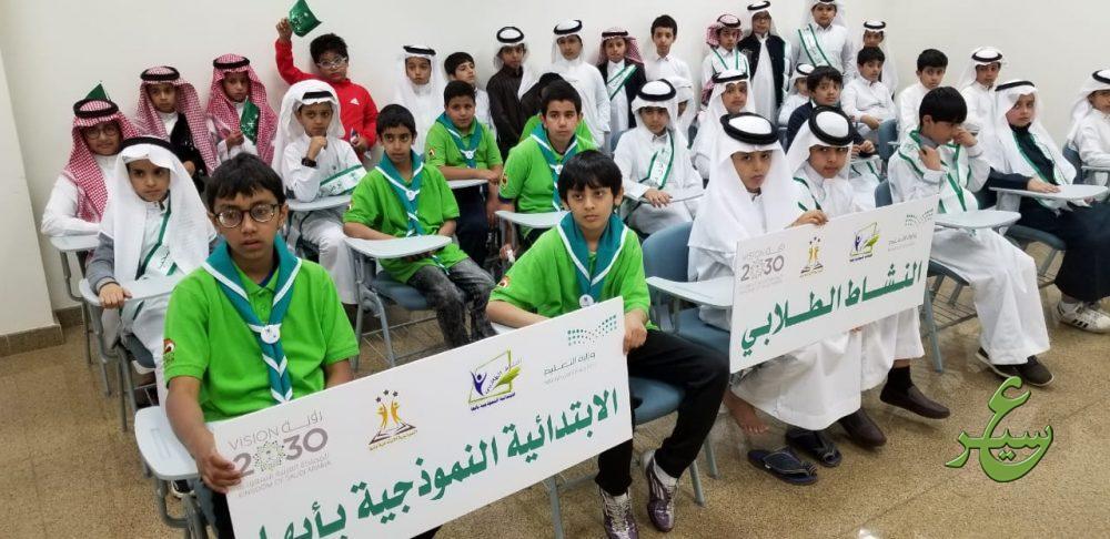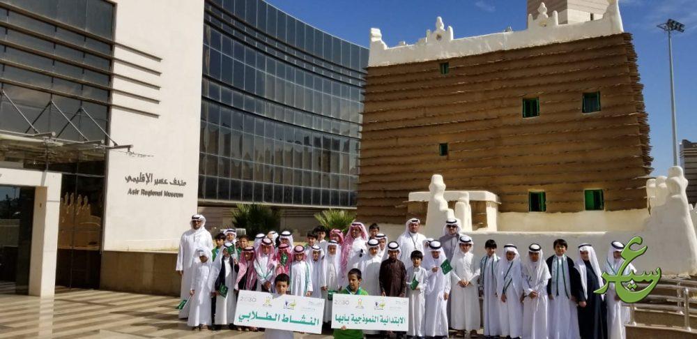باشراف من قائد الابتدائية النموذجية في أبها الاستاذ حمدان آل ثابت ، ومتابعة من رائد النشاط الاستاذ تركي البشري قامت المدرسة بالتصوير في البحار ومع أطول سارية علم في منطقة عسير ، وأيضاً عمل لوحة وطنية للوقوف مع القيادة حفظهم الله ، وكان ذلك بتوجيه من وكيل امارة عسير خالد الربيعة ، وتعتبر الابتدائية النموذجية بأبها أول مدرسة يصرح لها بهذا العمل .