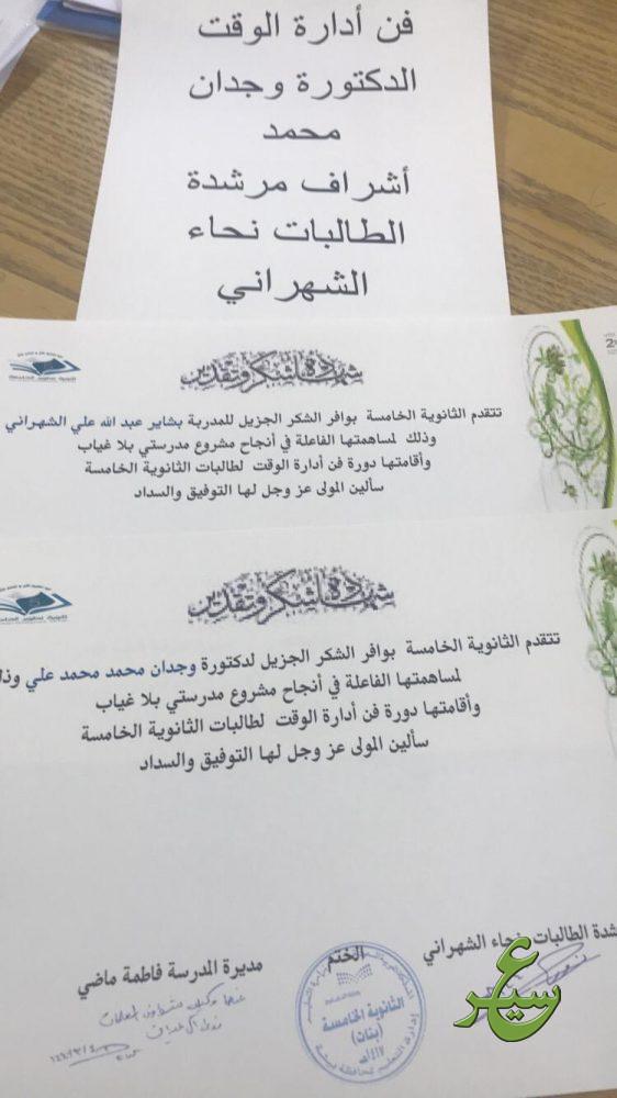 نفذت المرشدة الطلابية / نحا مبارك الشهراني بمدرسة الثانوية الخامسة بتعليم بيشة اليوم الإثنين ١٤٤٠/٣/٤هـ ، بمشاركة المعلمات وبعض الطالبات برنامج “مدرستي بلا غياب” ضمن مشاريع وحدة تطوير المدارس وتعزيز قيمة الانظباط لدى الطالبات وتعزيز السلوك الإيجابي لديهم بإستظافة “مركز اسدام ” لإقامة دورة بعنوان ( فن ادارة الوقت ) مع الدكتورة وجدان محمد والمدربة بشاير الشهراني .