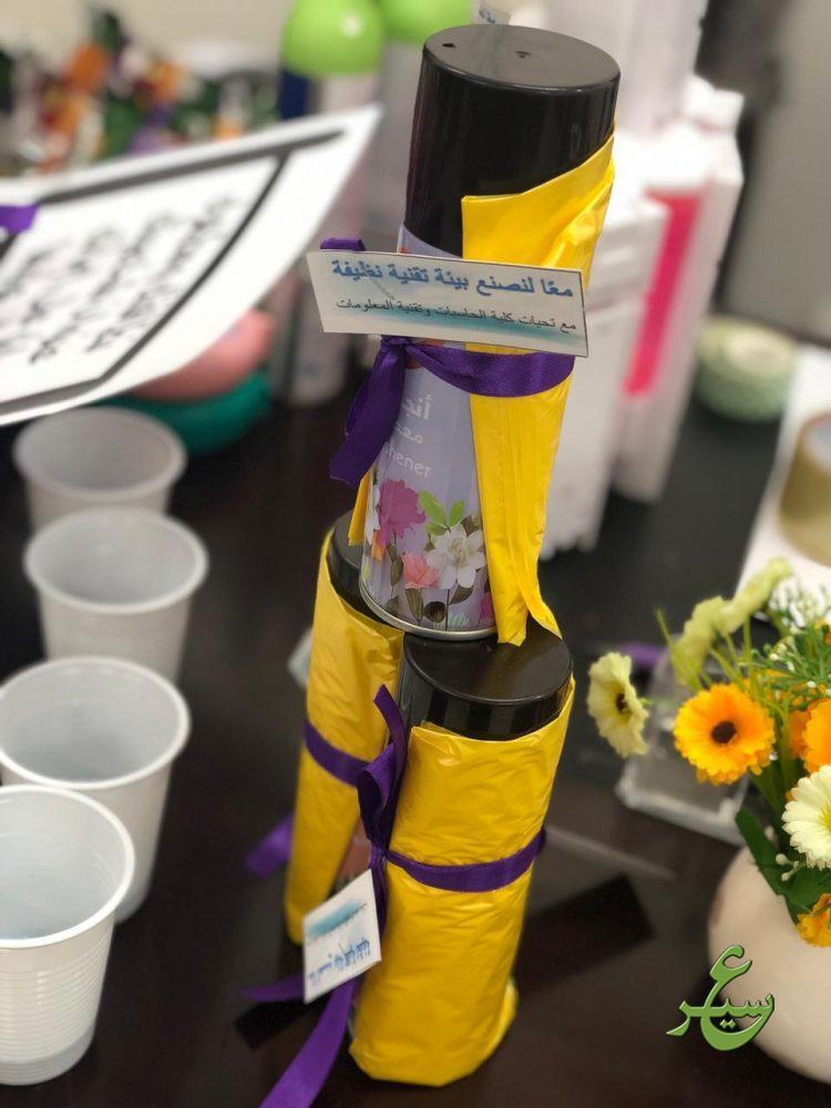 واشتمل يوم التوعية بتوزيع سلة مهملات بين ممرات الحاسب وتقديم النصايح للطالبات عن “النظافة”، وأيضاً بتوزيع بين الطالبات أكياس نفيات لتجميع فيه وليبقى المكان نظيفاً .
