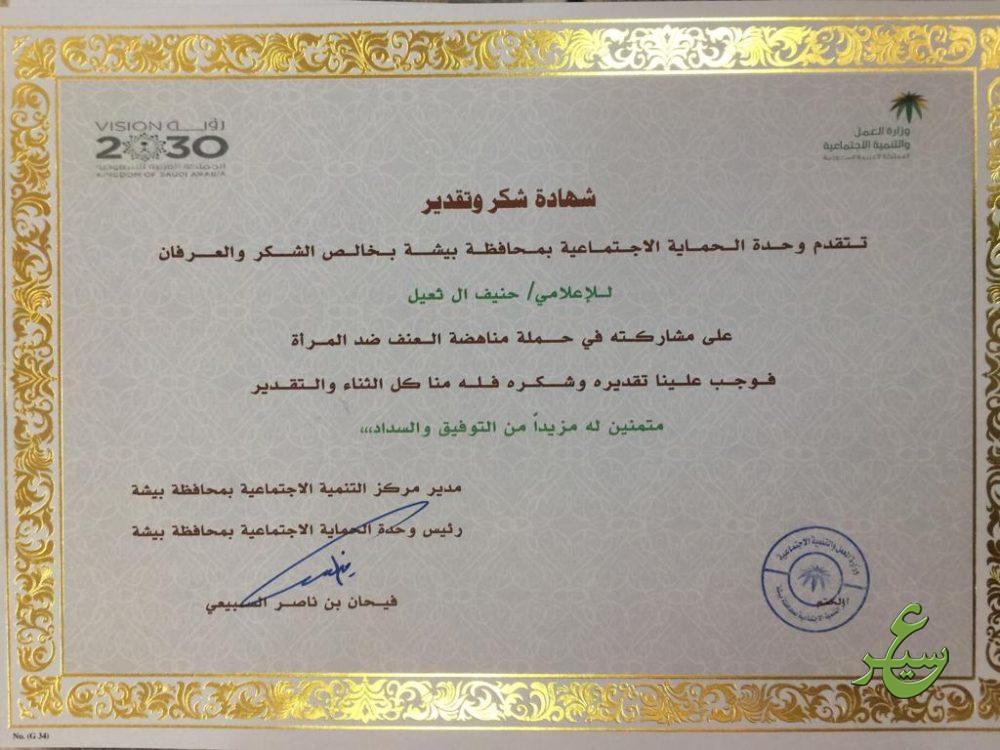 قدمت وحدة الحماية الإجتماعية بمحافظة بيشة شهادة شكر وعرفان للزميل / حنيف آل ثعيل مدير التحرير والمشرف العام على الصحيفة بمحافطة بيشة ، وذلك نظير مشاركته في حملة “مناهضة العنف لدى المرأة ” والذي أُقيمت في مركز توليب مول ببيشة ومستشفى الملك عبدالله ، وتمنوا له مزيد من التقدم والنجاح .