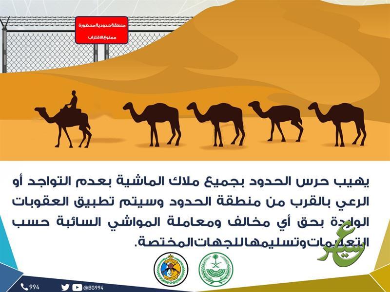 أهابت مديرية حرس الحدود بجميع ملاك الماشية عدم التواجد أو الرعي بالقرب من منطقة الحدود، محذرةً من أنه سيتم تطبيق العقوبات الواردة بحق أي مخالف.