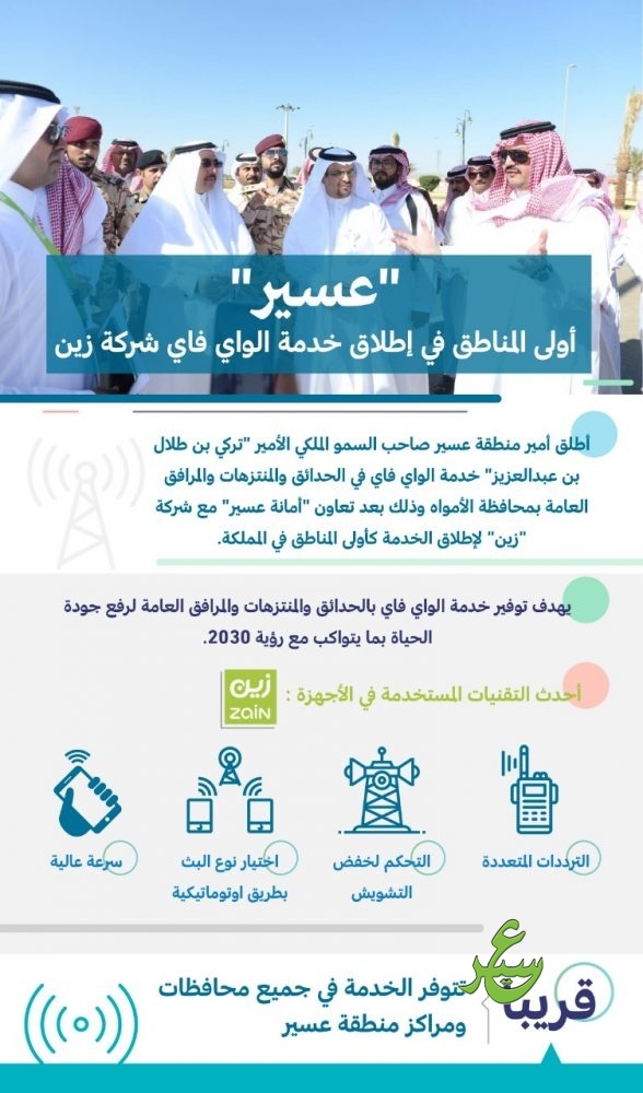 أكد سعادة أمين منطقة عسير الدكتور “وليد الحميدي” أن إطلاق خدمة الواي فاي المجاني لشركة زين بمحافظة الأمواه يعتبر حدثاً فريداً من نوعه حيث يأتي لأول مرة على مستوى المملكة ويبرهن على أن أمانة المنطقة لا تدخر جهداً ولا سبيلاً يؤدي إلى رفاهية المواطنين والارتقاء بالخدمات البلدية إلا وبذلته وذلك سعياً منها للمساهمة في تحقيق رؤية 2030، مضيفاً ان إطلاق خدمة الإنترنت المجاني بحديقة الأمواه ما هي إلا بداية لنشر الخدمة وإطلاقها في كافة الحدائق والمتنزهات والمرافق العامة بجميع محافظات ومراكز المنطقة وفق أحدث التقنيات، حيث يأتي هذا الإطلاق تواصلاً لما تقوم به الأمانة من جهودها التي تهدف للارتقاء بخدماتها البلدية المقدمة للمواطنين في كافة المجالات التي تشمل حتى الجانب الترفيهي.