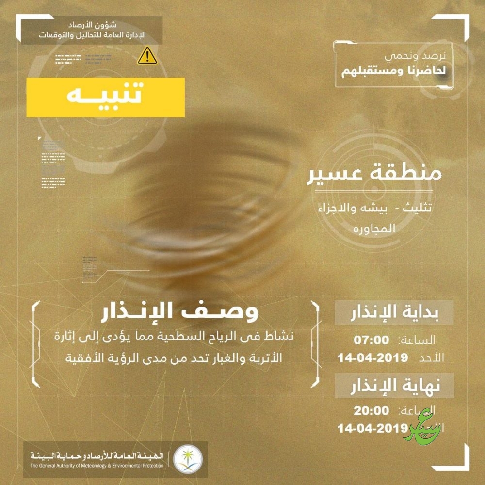 أصدرت الهيئة العامة للأرصاد وحماية البيئة اليوم، تنبيهاً بهطول أمطار رعدية على بعض محافظات منطقة عسير، يصحبها نشاط في الرياح السطحية المثيرة للأتربة الغبار.