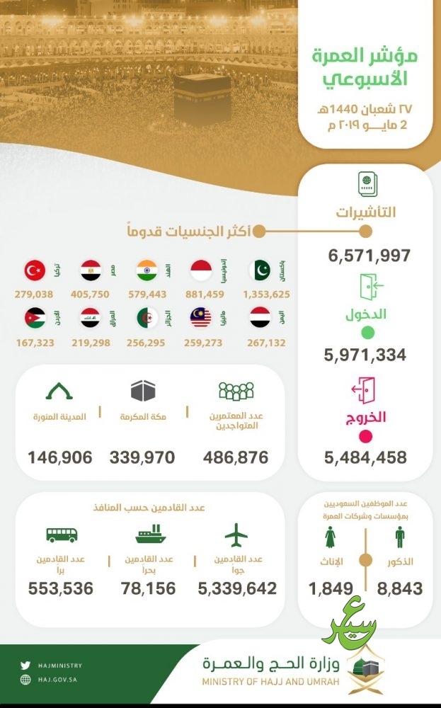 سجلت الإحصاءات التراكمية لمؤشر العمرة الأسبوعي، إصدار6,571,997 تأشيرة حتى تاريخ 27 شعبان لهذا العام، وجاء مجموع القادمين إلى المملكة 5,971,334معتمرًا، في حين بلغ عدد المعتمرين المتواجدين داخل المملكة 486,876معتمرًا، منهم 339,970 في مكة المكرمة، بينما يتواجد 146,906 في المدينة المنورة، فيما سجلت مغادرة 5,484,458معتمرًا بعد أن أدّوا العمرة والزيارة.