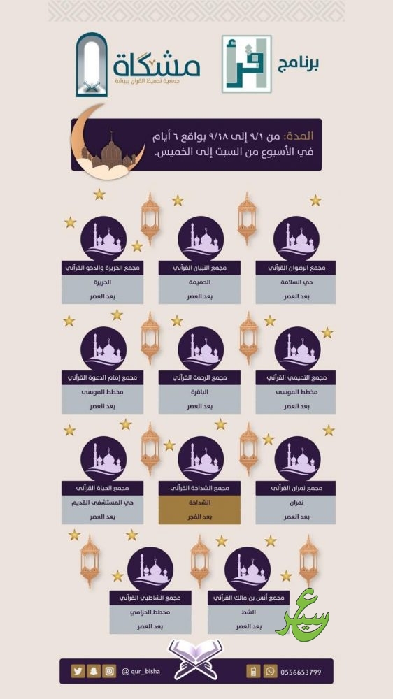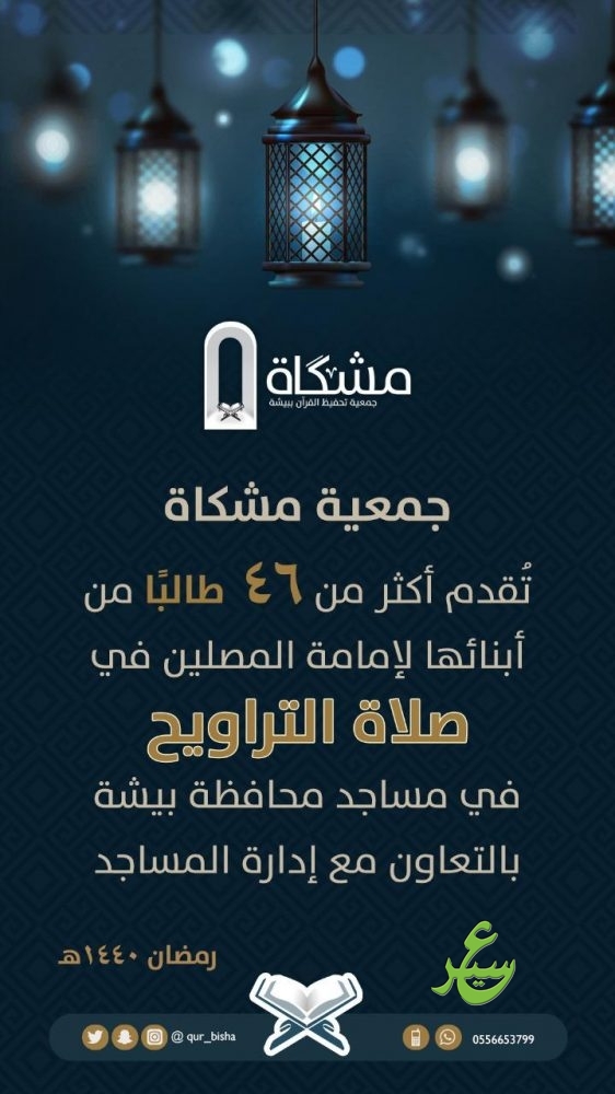 قدمت جمعية مشكاة لتحفيظ القرآن الكريم ببيشة أكثر من 46 طالبًا من أبنائها لإمامة المصلين في صلاة التراويح في مساجد المحافظة بالتعاون مع إدارة المساجد ببيشة، تأتي هذه المبادرة للعام الثاني على التوالي . حيث تقدم الجمعية لأبنائها برنامجًا تأهيليًا في شهري رجب وشعبان ومن ثم توزيعهم على المساجد لسد الاحتياج وتغذية المساجد بأئمة أكفاء، هذه المبادرة التي لاقت صدى وقبول في المجتمع تأتي ضمن باقة من البرامج القرآنية التي تقدمها الجمعية لكافة أفراد المجتمع رجالاً ونساءًا كبارًا وصغارًا لتعليم وتحفيظ القرآن الكريم والتلقين وتصحيح التلاوة للأطفال وكبار السن في عدد من المواقع في أنحاء محافظة بيشة ، كما هو موضح بالاعلان المرفق ، علاوة على الحلقات الخاصة بعمال البلدية يتعلمون من خلالها القراءة الصحيحة للقرآن الكريم والحفظ والمراجعة ، والجمعية تسعى جاهدة لتقديم كل ما من شأنه اتساع رقعة الخيرية وتعليم كتاب الله .