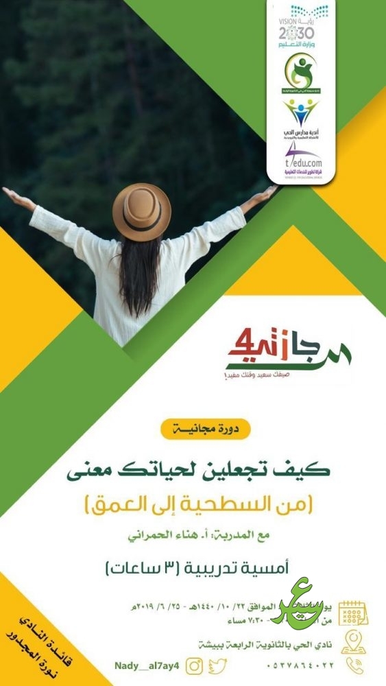 انطلاقاً من حرص إدارة برنامج أندية الحي للأنشطة التعليمية والترفيهية على تدريب طلابها وطالباتها وإعدادهم بمهارات حياتية مختلفة من خلال برامج نوعية تنفذها الأندية ، ومن خلال هذه البرامج يقيم نادي الحي بالثانوية الرابعة ببيشة مساء غدٍ الثلاثاء الموافق ١٤٤٠/١٠/٢٢هـ ، دورة تدريبية لتطوير الذات وهذه الدورة مجانية ، وستكون هذه الدورة عن كيف تجعلين لحياتك معنى تحت عنوان ( من السطحية إلى العمق ) ،وستقدم هذه الدورة المدربة هناء الحمراني وستكون مدتها ثلاث ساعات ، من الساعة الرابعة والنصف عصراً إلى الساعة السابعة والنصف مساء .
