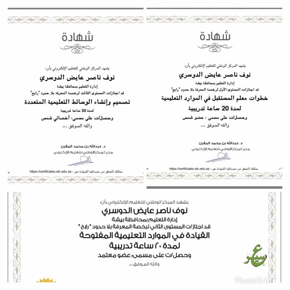 لا شيء يضاهي لحظة الإنجاز التي يقطف فيها الشخص ثمار جهده ، ومن هذا المنطلق فقد حصلت المبدعة والمتميزة الاستاذة /نوف ناصر الدوسري من إدارة التعليم بمحافظة بيشة على رخصة المعرفة بلا حدود “رابح”التابعة للتعليم الإلكتروني ، والتي تهدف إلى تمكين أعضاء هيئة التدريس والمعلمين من نشر واستثمار المعرفة ، حيث اجتازت “الدوسري” المستوى الأول للرخصة وذلك بمعدل 20 ساعة تدريبية،وحصلت أيضاً على عضوية شمس في “خطوات معلم المستقبل في الموارد التعليمية” ، وذلك بمعدل 20 ساعة تدريبية ، وقد شهد المركز الوطني لتعليم الإلكتروني على ذلك ، كما حصلت ” نوف الدوسري ” أيضاً على رخصة المعرفة بلا حدود تصميم وإنشاء الوسائط التعليمية المتعددة لمدة 30 ساعة تدريبية.>