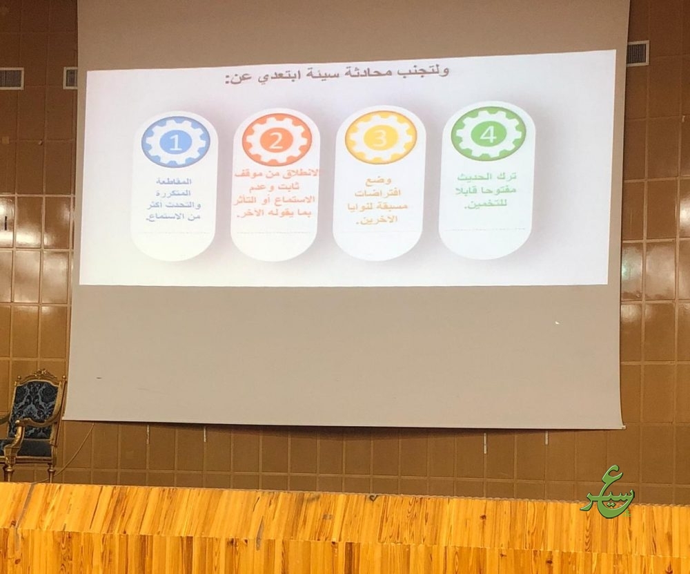 وتحدثت عن ثلاثية الأسلوب الجذاب الصوت، الفكاهة ، والوقفات .وفي ختام الدورة أوضحت المتطلبات الأساسية لحديث مؤثر وقالت تدربي ،حضري، مارسي ركزي على المقدمة و الخاتمة واقرئي جمهورك وخاطبي الأذن و العين ، واختتمت “الفصام” حديثها بشكرها لجميع الحاضرات متمنيةً أنهن استفدن من الدورة .