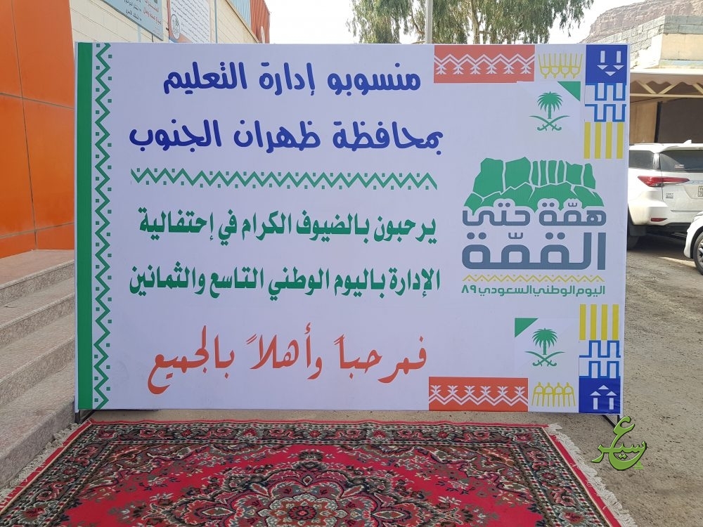 برعاية محافظ ظهران الجنوب الأستاذ محمد بن فلاح القرقاح احتفلت إدارة التعليم صباح اليوم الخميس ١٤٤١/١/٢٧ بذكرى اليوم الوطني ٨٩ وذلك بحضور مديري الإدارات الحكومية ومشائخ القبائل وقادة المدارس على مسرح الصالة المغلقة بنادي العرين .