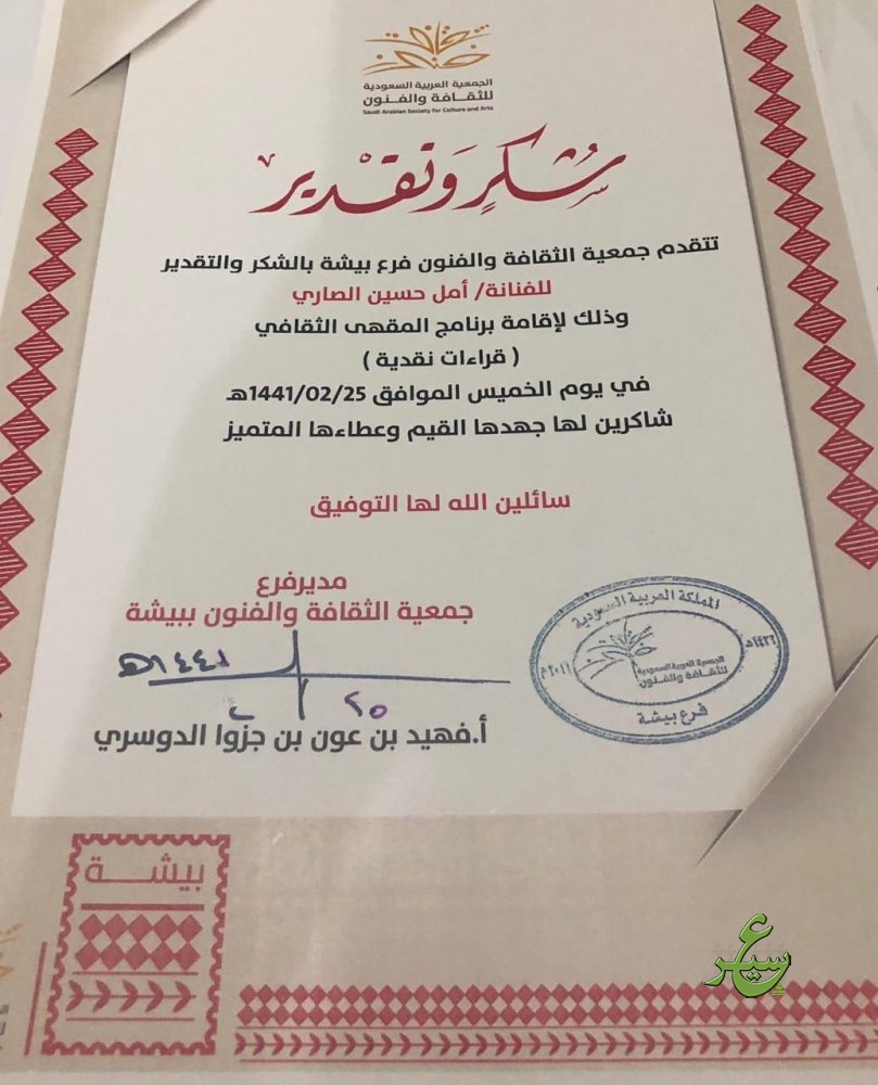 بعد ذلك عرفت صاحبة الحضور المميز والمتألقة دائماً الأستاذة/ أمل الصاري بنفسها ، كونها رئيسة اللجنة الثقافية النسائية بمحافظة بيشة ، و فنانة تشكيلية معروفة وقائدة مدرسة ، حيث شاركت ” الصاري ” في العديد من المعارض على مستوى المملكة و خارجها في البحرين و الإمارات و تركيا ، وقد حصلت على العديد من الجوائز في مسابقات مختلفة ، وتعتبر الفن من وجهة نظرها ليس دراسة بل هو هواية وموهبة فنانة تشكيلية نمت موهبتها بالأطلاع و التعمق للمتقنين لهذا الفن حتى وصلت لمستوى عالي في الفن التشكيلي .