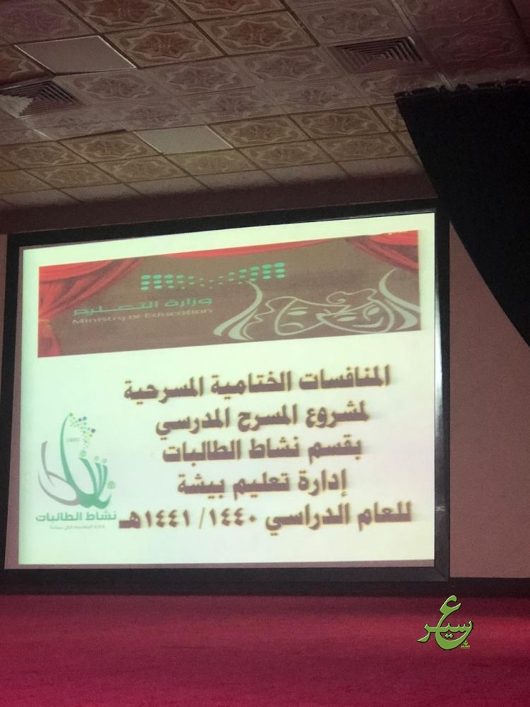 شاركت إدارة تعليم بيشة ممثلة بقسم نشاط الطالبات في المنافسات الوطنية المنفذة بمناطق ومحافظات المملكة بتأليف وتدريب وعرض المسرحيات وذلك من خلال مشروع المسرح المدرسي الذي نفذ في مدارس التعليم العام والأهلي والتحفيظ بإدارة تعليم بيشة للسنة الرابعة على التوالي.
