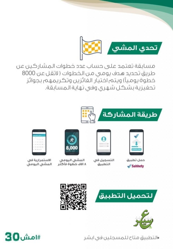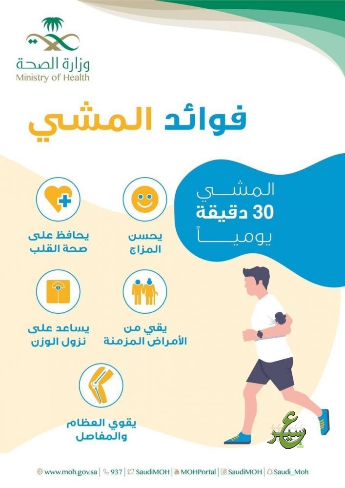 دعت صحة بيشة للمشاركة في المشروع الوطني للمشي ” امش 30 ” والذي يهدف الي تعزيز الصحة العامة ونشر ثقافة المشي ، وكذلك لرفع معدل الممارسين للمشي خاصة المصابين والمعرضين للاصابة بالامراض المزمنة ، وأشارت صحة بيشة إلى اهمية تسجيل ( تطبيق صحتي )والعمل من خلاله والتسجيل والمشاركة بالمشي ، والدخول في تحدي المشي لتحقيق المستهدف 8000 خطوة يومياً.