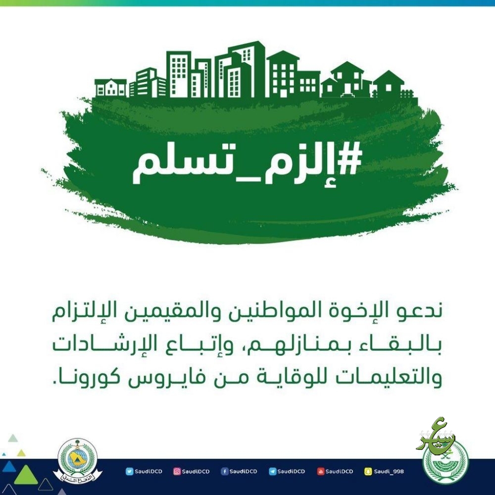 وثبت الدفاع المدني تغريدة مصممة على حسابه تحمل شعار #إلزم_تسلم، داعين في التغريدة إلى الالتزام بالتعليمات الصادرة من الجهات الحكومية لضمان سلامة المجتمع، والحد من انتشار الفيروس بين المواطنين والمقيمين.