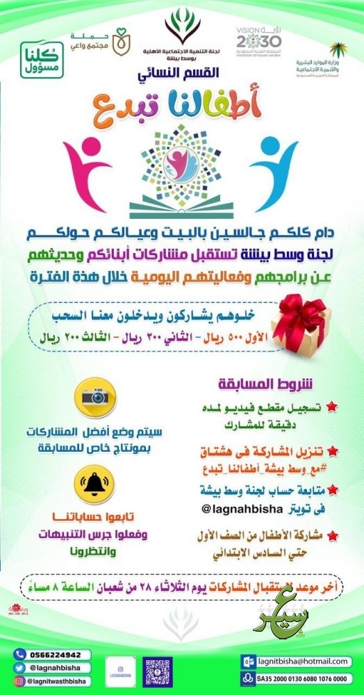 أطلقت لجنة التنمية الاجتماعية الأهلية بوسط بيشة مبادرة بعنوان ” أطفالنا تبدع ” ،وذلك ضمن حملة مجتمع واعي كلنا مسؤول ،والتي تهدف لإتاحة الفرصة للأطفال،وذلك لنقل تجاربهم من خلال نقل مشاركات ابنائكم وحديثهم عن برامجهم وفعالياتهم اليومية من أدعية وأحاديث تعلموها ،او متابعة برامج هادفة ، آيات قرآنية تم حفظها ، معلومات صحية يطبقوها ، نصائح يوجهوها للمجتمع ،وقد وضعت إدارة اللجنة شروطاً للإنظمام في المسابقة ومن الشروط التي وضعتها اللجنة للمشاركين هي تسجيل مقطع فيديو لمدة دقيقة للمشارك ،وتنزيل المشاركة مع هشتاق #مع وسط_بيشة _ أطفالنا تبدع ،وكذلك متابعة حساب لجنة وسط بيشة في التويتر ،المشاركة من الصف الأول الابتدائي حتى الصف السادس الابتدائي.