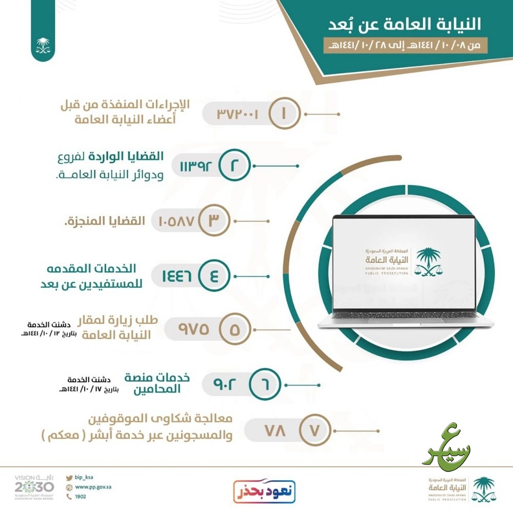 تستمر النيابة العامة في تقديم كافة أعمالها المنوطة، بالإضافة إلى تقديم خدماتها عن بُعد لعموم المستفيدين على مستوى فروعها ودوائرها في شتى مناطق المملكة ومحافظاتها وفق منظومتها الإلكترونية وبيئتها التقنية المتقدمة، طبقاً لعمليات آمنة ومشفرة وبجودة عالية، حيث نفّذت خلال (٢١) يوماً من تاريخ ٠٨ /١٠ / ١٤٤١هـ إلى ٢٨ / ١٠ / ١٤٤١هـ أكثر من (٣٧٢٠٠١) إجراءً قام به أعضاء النيابة العامة، وبلغت عدد القضايا الواردة لفروع ودوائر النيابة العامة (١١٣٩٢) ،المنجز منها(١٠٥٨٧ ) ، وتم معالجة (٧٨) شكوى للمواقيف والمسجونين عبر منصة أبشر أيقونة (معكم) ، كما بلغت الخدمات المقدمة عن بعد للمستفيدين (١٤٤٦) والتي كانت محل اهتمام وأولوية في إنجازها بشكل فوري وآني، وتم استقبال (٩٧٥) طلباً لتحديد موعداً للحضور لمقار النيابة العامة والتي دشنت الخدمة لها بتاريخ ١٢ /١٠ /١٤٤١هـ ، وبلغت الخدمات المقدمة عبر منصة المحامين (٩٠٢) والتي دشنت خدماتها بتاريخ ١٧ / ١٠ / ١٤٤١هـ .