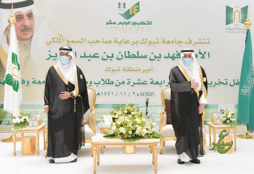 نقل صاحب السمو الملكي الأمير فهد بن سلطان بن عبدالعزيز أمير منطقة تبوك تحيات وأعتزاز خادم الحرمين الشريفين الملك سلمان بن عبدالعزيز آل سعود وسمو ولي العهد -حفظهما الله – لخريجي وخريجات الدفعة الرابعة عشر من جامعة تبوك .