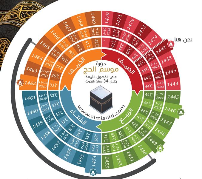وأوضح أن النسخة تتضمن حركة دخول شهر ذي الحجة بين الفصول الأربعة، حيث يلاحظ أن الحركة تراجعية (عكسية)؛ حيث إن موسم الحج يدخل في هذه السنوات في فصل الصيف، ومن ثم سيدخل عام 1445هـ الموافق 2024م في فصل الربيع، وسيدخل في عام 1454هـ (2033م) في فصل الشتاء، وفي 1462هـ (2040م) سيدخل في فصل الخريف، إلى أن يعود في عام 1470هـ (2048م) ليدخل في الصيف.