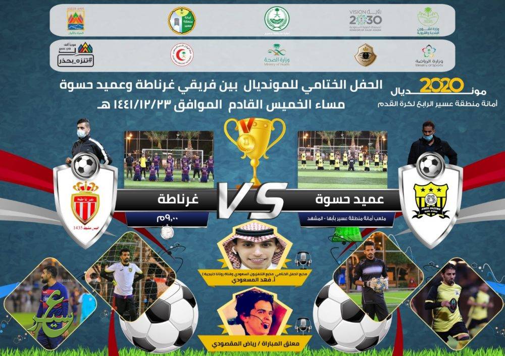 يُختتم عند التاسعة من مساء يوم الخميس مونديال عسير الرياضي الصيفي الرابع لكرة القدم ضمن فعاليات صيف أبها 2020م والذي تنظمه أمانة عسير على ملعب المشهد بمدينة أبها ، وشهد في نسخته الحالية الإستثنائية مشاركة 32 فريقاً من 3 مناطق جنوبية وعدة محافظات من منطقة عسير .