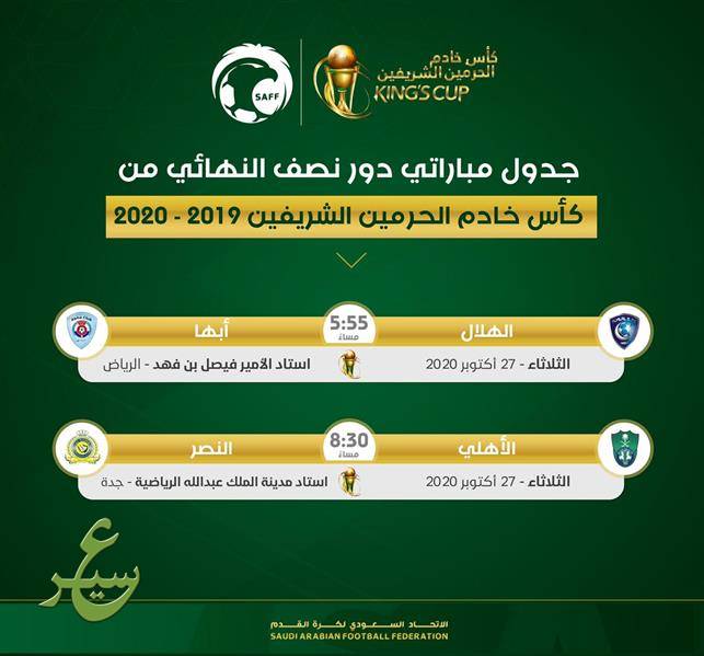 أعلنت لجنة المسابقات بالاتحاد السعودي لكرة القدم، موعد مباراتي نصف نهائي كأس خادم الحرمين الشريفين للموسم الرياضي 2019-2020.