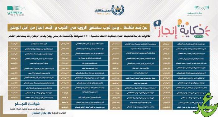 حققن طالبات مدرسة تحفيظ القرآن بتثليث نسبة 100% إنضباطاً في منصة مدرستي ، وذكرت قائدة المدرسة بدور بدري السلمي إن 55 طالبة حققن هذه النسبة بدون غياب ولا تأخير حتى الأسبوع الثامن عشر ، وذلك في الإنضباط عبر الحصص الإفتراضية في منصة مدرستي ، وقدمت قائدة المدرسة شكرها وتقديرها لجميع الطالبات وأسرتهن ،وقالت بهن يفخر الوطن ومنا يستحقوا الشكر .