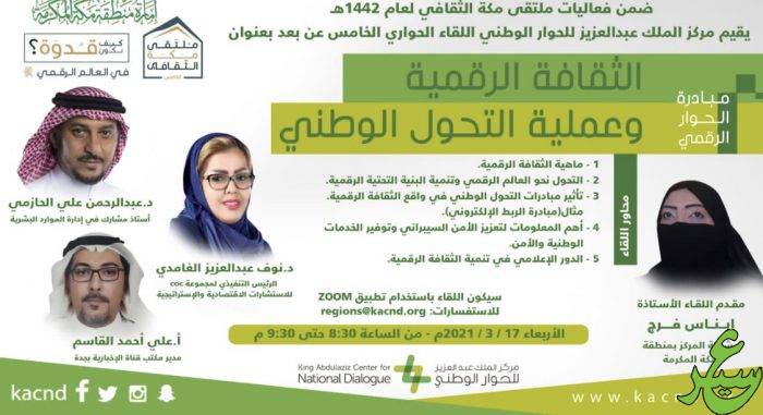 أقام مركز الملك عبد العزيز للحوار الوطني عن بعد مساء يوم الأربعاء 4 شعبان 1442هـ الموافق 17 مارس 2021م، لقاء حوارياً بعنوان: “الثقافة الرقمية وعملية التحول الوطني”، والذي جاء ضمن مبادرة “الحوار الرقمي” التي ينفذها المركز في إطار مشاركته في فعاليات ملتقى مكة الثقافي الخامس المقامة تحت عنوان: “كيف نكون قدوة في العالم الرقمي؟”.