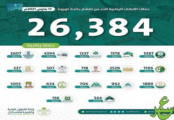 نفذّت فرق الرقابة الميدانية التابعة لوزارة الشؤون البلدية والقروية والإسكان (26384) زيارة رقابية على منشآت القطاع الخاص ذات العلاقة بالصحة العامة في مختلف مناطق المملكة وذلك خلال يوم أمس، للتأكد من التزام أصحاب المنشآت باللوائح والاشتراطات البلدية والبرتوكولات الصحية ومتابعة امتثال المنشآت للإجراءات الاحترازية للوقاية من فيروس كورونا المستجد (كوفيد 19)، والتوجيهات الصادرة في هذا الخصوص.