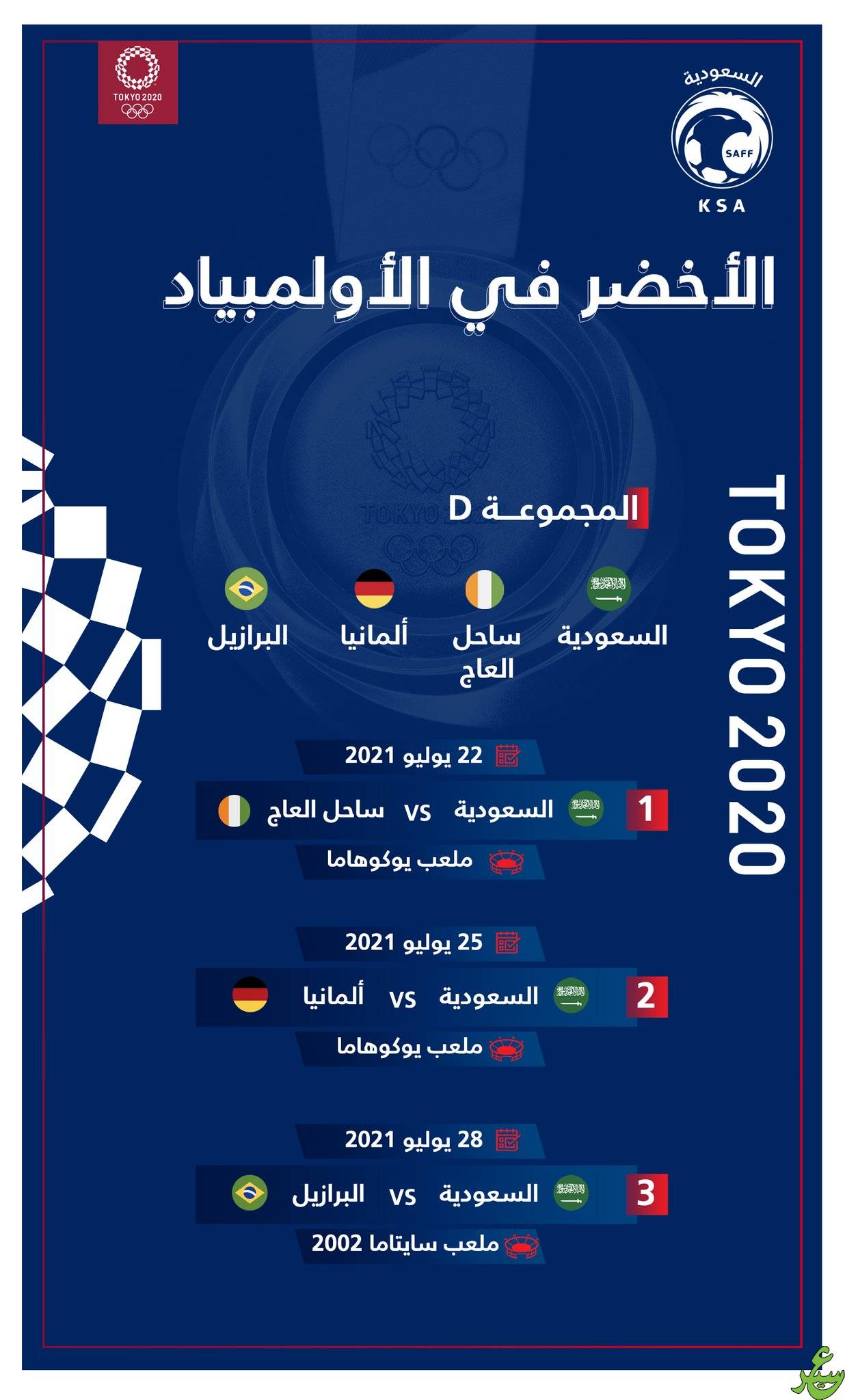 وتُختتم مباريات المنتخب السعودي في هذه المجموعة بمباراة تجمعه مع منتخب البرازيل في يوم 28 يوليو المقبل على ملعب سايتاما 2002.