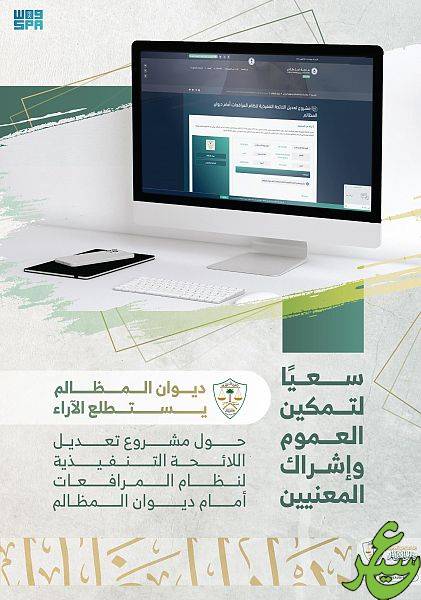 ودعا ديوان المظالم الجهات والمختصين والأفراد إلى المشاركة في الاستطلاع الذي يطلقه بشأن مشروع تعديلات اللائحة التنفيذية لنظام المرافعات أمام ديوان المظالم، بدءاً من يوم الثلاثاء 28/2/1443هـ، لمدة 14 يوماً, بهدف تمكين العموم من إبداء آرائهم وملاحظاتهم حول مشروع التعديلات، وذلك عبر الرابط التالي: (https://istitlaa.ncc.gov.sa/ar/Judgment/bog/pleadingsystem/Pages/default.aspx).
