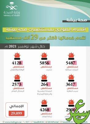 قدّمت أقسام الطوارئ بمستشفيات صحة بيشة خدماتها لـ 29,099 مستفيد، خلال شهر نوفمبر للعام الحالي 2021م.