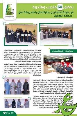 نظم فرع هيئة الصحفيين السعوديين بحفرالباطن ورشة عمل عن “صحافة الموبايل” قدمها مشرف لجنة الإنتاج والتوثيق المرئي في فرع هيئة الصحفيين بحفرالباطن ومدير انتاج قناة mbc في حفرالباطن المدرب سلطان العايد وذلك بحضور 60 متدرب ومتدربة على مسرح الغرفة التجارية.
