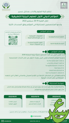تنظم جامعة الملك خالد ممثلة في كلية العلوم والآداب بمحايل عسير المؤتمر الدولي الأول للعلوم البيئية التطبيقية، خلال الفترة 19-20 سبتمبر 2022م.