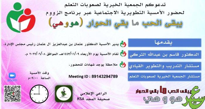 نظَّمتِ الجمعيةُ الخيريةُ لصعوباتِ التعلُّمِ ضمنَ مبادراتِها المجتمعيةِ (عن بُعد عبر برنامج الزووم) أُمسيةً تطويريةً اجتماعيةً، عنوانُها: (ويبقى الحبُّ ما بقيَ الحوارُ) :(هو وهي)، قدَّمَها الدكتور قاسم التركي مستشارالجمعية، بمشاركة عددٍ كبيرٍ من الأهالي والمختصين والمختصات في مجال صعوبات التعلُّمِ، حيث قدَّم العديد من المهارات والأفكار المساعدة على الإبداع؛ من أجل التنعم بحياةٍ أسرية سعيدة، وتحسين الأداء في بيئة الأسرة، وقد حظيت بتفاعلٍ وحماسٍ من الحضورِ، حيث تناولت الأمسيةُ محاورَ متعددةٍ ،وقد اتَّسمت بالتفاعل بين المدرب والحضور؛ الأمر الذي حقَّقَ الفائدة والمتعةَ معًا.