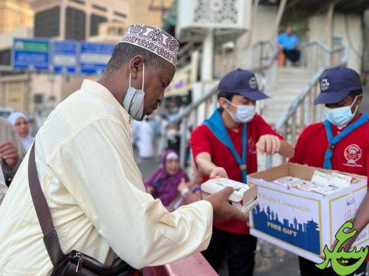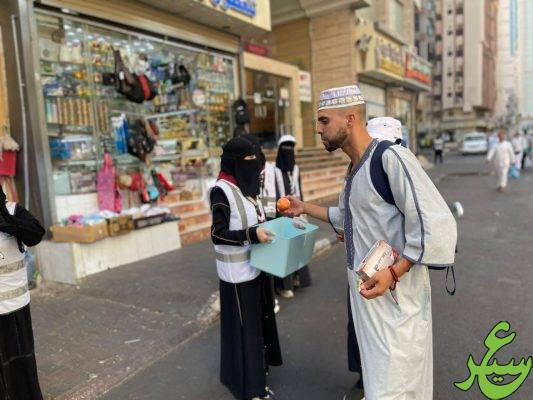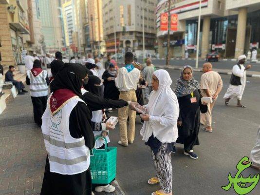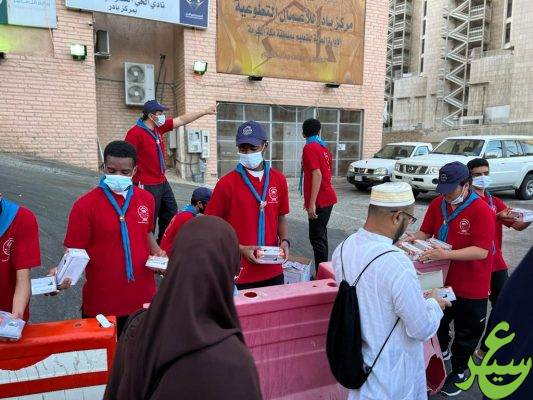 وتولى الكشافون والفتيات توزيع الفواكة على الحجاج في المنطقة المركزية القريبة من المسجد الحرام كما تم توزيع ١٨٠٠ قطعة كيك مغلفة و ٨٨٠٠ وجبة جافة و٤٠٤٨ عبوة ماء بارد