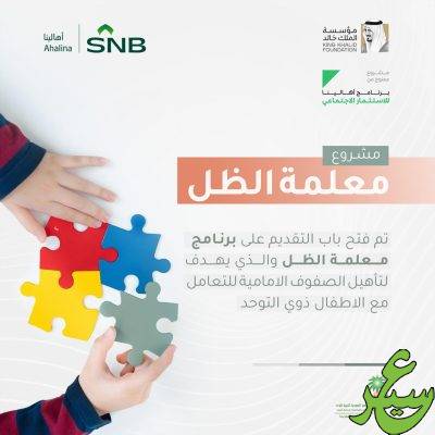 أعلنت الجمعية السعودية الخيرية للتوحد عن إطلاق مشروع “معلمة الظل” وهو مشروع حاصل على دعم من برنامج أهالينا للاستثمار الاجتماعي ضمن برنامج أطلقته مؤسسة الملك خالد بالشراكة مع البنك الاهلي السعودي .