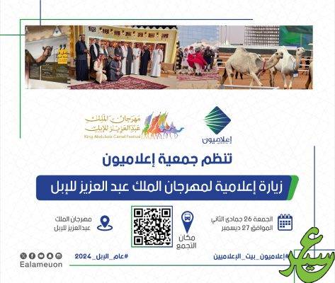 نظمت جمعية إعلاميون زيارة إعلامية لمهرجان الملك عبدالعزيز للإبل 2024، والمقام حالياً في ميدان الملك عبدالعزيز بالصياهد، تحت شعار “عز لأهلها”، حيث حضر الوفد جانب من تنافس أهل الأبل للفوز بجوائز المهرجان التي تفوق 200 مليون ريال، وتابعوا شوط الأميرة نورة بنت عبد الرحمن المخصص للنساء، ومنافسات الطبع، والتي يمتاز بها المهرجان ولا توجد في أي مهرجانات أخرى للإبل سواء داخل المملكة أو خارجها.