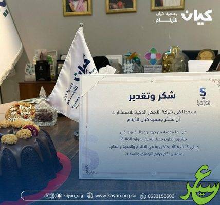 وقد أبت الجمعية إلا أن تكون من الجمعيات المتميزة والهادفة والفريدة في برامجها ومشاريعها وفعالياتها. حيث حصلت جمعية كيان للأيتام خلال الأسبوع على شهادة شكر وتقدير من شركة الأفكار الذكية للاستشارات وذلك في ختام دورة مشروع تطوير مدراء تنمية الموارد المالية التي أُقيمت في مؤسسة الملك خالد، واستمرت قرابة العام وحضرها من الجمعية الأستاذة مي السلطان المدير المالي للجمعية وقدمت فيها العديد من المخرجات.
