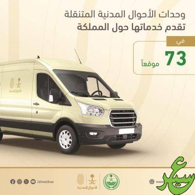 تقدم الوحدات المتنقلة للأحوال المدنية خدماتها للرجال والنساء في 73 موقعًا حول المملكة، ضمن مبادرة “نأتي إليك” التي تنفذها وكالة وزارة الداخلية للأحوال المدنية للجهات الحكومية والخاصة، ومبادرة “موجودين” الموجهة لخدمة المحافظات والمراكز والقرى البعيدة عن مكاتب الأحوال المدنية.
