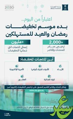 أعلنت وزارة التجارة بدء التخفيضات الموسمية لشهر رمضان المبارك وعيد الفطر المبارك في المنشآت التجارية والمتاجر الإلكترونية اعتباراً من اليوم الأحد 10 شعبان 1446هـ الموافق 9 فبراير 2025م، وتستمر 5 شوال 1446هـ الموافق 3 أبريل 2025م.