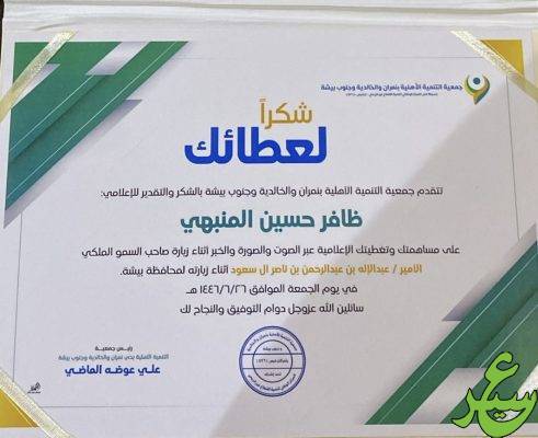 كرّمت جمعية التنمية الأهلية بنمران والخالدية وجنوب بيشة الزميل ظافر حسين المنبهي المصور الصحفي في صحيفة عسير الإلكترونية بمحافظة بيشة ، بشهادة شكر وتقدير ، وذلك نظير مساهمته وتغطيته الإعلامية لزيارة صاحب السمو الملكي الأمير عبدالإله بن عبدالرحمن بن ناصر آل سعود للجمعية بمحافظة بيشة.