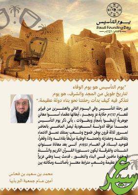 أكد محمد بن سعـيد بن فحاس أمين عــــــــام جمعية البر بأبها أن “يوم التأسيس هو يوم الوفاء لتاريخ طويل من المجد والشرف، هو يوم نتذكر فيه كيف بدأت رحلتنا نحو بناء دولة عظيمة.”
