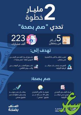 وتأتي حملة “صم بصحة” في إطار الجهود المبذولة لتعزيز ثقافة الحياة الصحية خلال الشهر الفضيل من خلال إجراء الفحص الصحي الدوري باقة “صم بصحة” والتي تتضمن 8 فحوصات مخبرية، والتعريف بالخدمات المتنوعة المقدمة عبر مراكز الرعاية الأولية، وتشجيع المواطنين والمقيمين على المشي اليومي بما لا يقل عن 8 آلاف خطوة، والنوم الكافي لمدة 8 ساعات باليوم.