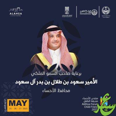 برعاية صاحب السمو الملكي الأمير سعود بن طلال بن بدر محافظ الاحساء ، يُقام منتدى الاحساء صديقة الطفل 2025 ، خلال الفترة 25-27 مايو الجاري .