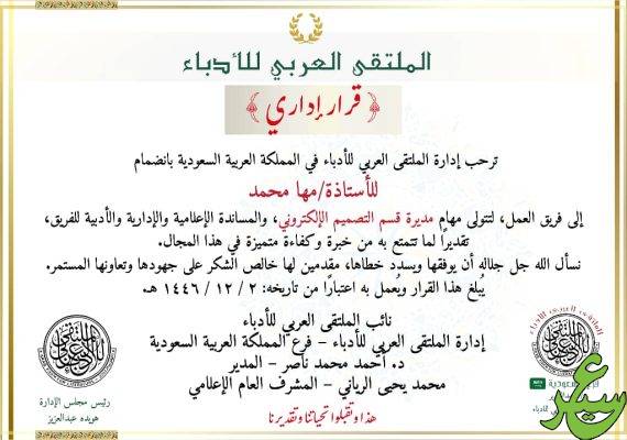 وتقدم الدكتور أحمد المدير بالشكر للأستاذة مها مشيدا بخبرة الأستاذة :مها محمد شاكرا لها على جهودها وتعاونها المستمر والمامها بواجبات عملها المكلفة به بالملتقى العربي للأدباء بالسعودية يبلغ الأمر الصادر للأستاذة ويعمل به من تاريخه صدوره ٢ /١٢ /١٤٤٦هجري