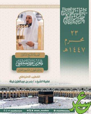 أعلنت رئاسة الشؤون الدينية بالمسجد الحرام والمسجد النبوي، عن أسماء خطيبي وأئمة صلاة الجمعة في الحرمين الشريفين ليوم الجمعة الموافق 23 محرّم 1447هـ، وذلك ضمن جدولها الدوري لتنظيم الإمامة والخطابة.