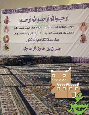 أقامت أسرة ال مداوي عبيدة قحطان ، مساء يوم الخميس ٢٩-١-١٤٤٧هـ ، حفلاً تكريمياً لسعادة الدكتور جبران بن مداوي ال مداوي ، بمناسبة حصوله على درجة الدكتوراة بامتياز مع مرتبة الشرف بحضور أصحاب السعادة من داخل المملكة وخارجها، وبدء الحفل بكلمة ترحيبية من المحتفي به بالحاضرين ، وتولت فقرات الحفل بقصر الشروق بمحافظة طريب التابعة لمنطقة عسير .